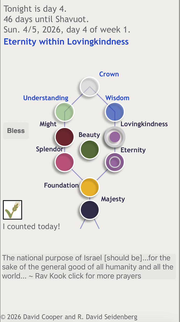 Get the Omer Counter app (now completely free!) from the App store! Get the ANDROID version from Google Play. David Cooper created an iPhone app in 2009 based on javascript for the omer widget I wrote in 2008 (see the widget at right), and implemented an idea I had: the Tree of the Sefirot appears, with a ring around the Sefirah of the week and a dot inside the Sefirah of the day. David Cooper also added the count formula and blessing in Hebrew, English and transliteration, and he updates the app with new features every year, like changing the day based on sunset in your actual location, keeping track of which days you've counted, and sending you reminders to count. The iPhone version of the app also displays botanical illustrations by Pauline Frankenberg for each day. I also choose quotes for each day. Every year they change a little bit, but in 2020 there were much bigger changes in response to COVID. Since 2020, you can also use the app to count the 49 days between Tisha B'Av and Rosh Hashanah! Follow the links to get the app for iPhone or Android. (Click here for everything else OMER on neohasid—widgets you can put on a webpage (see above and right), Rainbow Day liturgy, the spring blessing for flowering trees, etc.)